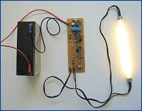 Fluorescent Tube Driver — provides fluorescent lighting from a 6V rechargeable battery. Ideal for emergency, camping and no-mains lighting applications. Uses a transistor driven converter circuit and a custom wound transformer and coil to generate the higher voltages needed by the fluorescent tube. Built-in filament preheat function helps prevent premature blackening of the tube. Output power 6 Watts.
